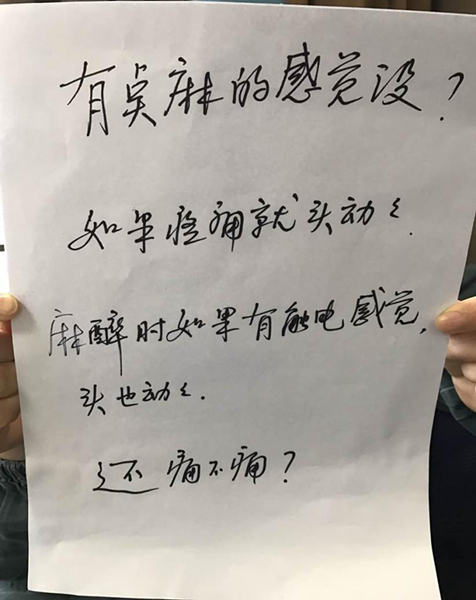麻醉开始了,患者选择的是臂丛麻醉,这对医患交流提出了更高的要求,患者必须能随时传达自身感受,才能确保麻醉的安全和成功。在麻醉医生进行麻醉的同时,手术医生配合麻醉进程用纸条文字的方式和患者进行沟通,巡回护士严密地观察反馈,“痛不痛”,“如果痛就点点头”,表情原本只是几句简单的话,倒是变得生动了起来。在多方的共同努力下,手术取得了成功,患者家属们对医护人员的关爱表示感谢!