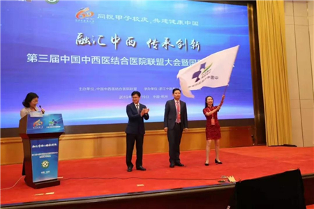 ▲中国中西医结合医院联盟的旗帜由本届承办方代表吕伯东院长,交由理事长单位代表夏平副院长,成功传递给了下一届承办方——广西中医药大学附属瑞康医院代表陈日兰副院长的手中。
