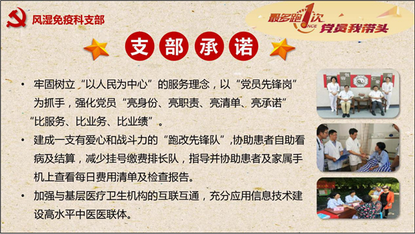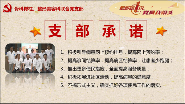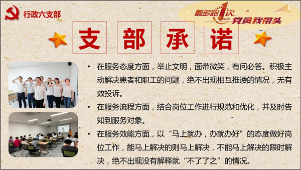 近期,为深化医疗卫生服务领域“最多跑一次”改革,积极响应院党委“最多跑一次,党员我带头”主题活动部署,医院各支部积极开展“亮承诺、比贡献”活动,向社会公开承诺践诺,通过自我加压、自我革命的形式改善服务态度,改进服务流程,提升服务质量,积极发挥党员的先锋模范带头作用!今天,让我们来看一看他们的承诺吧!(排名不分先后)。(党办)