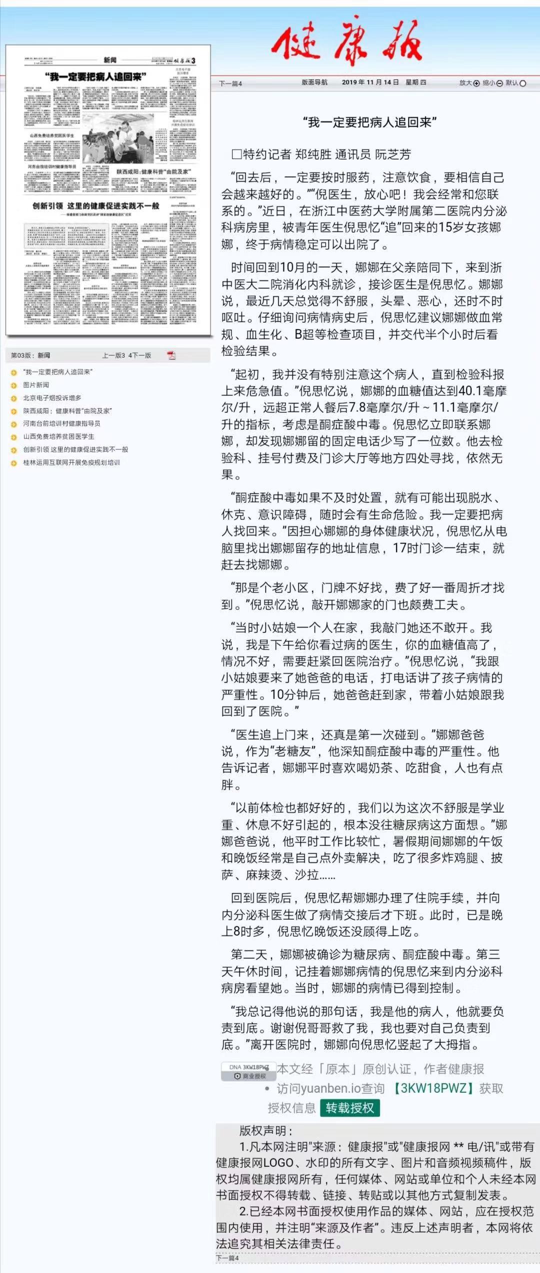 “当时小姑娘一个人在家,我敲门她还不敢开。我说,我是下午给你看过病的医生,你的血糖值高了,情况不好,需要赶紧回医院治疗。”倪思忆说,“我跟小姑娘要来了她爸爸的电话,打电话讲了孩子病情的严重性。10分钟后,她爸爸赶到家,带着小姑娘跟我回到了医院。”