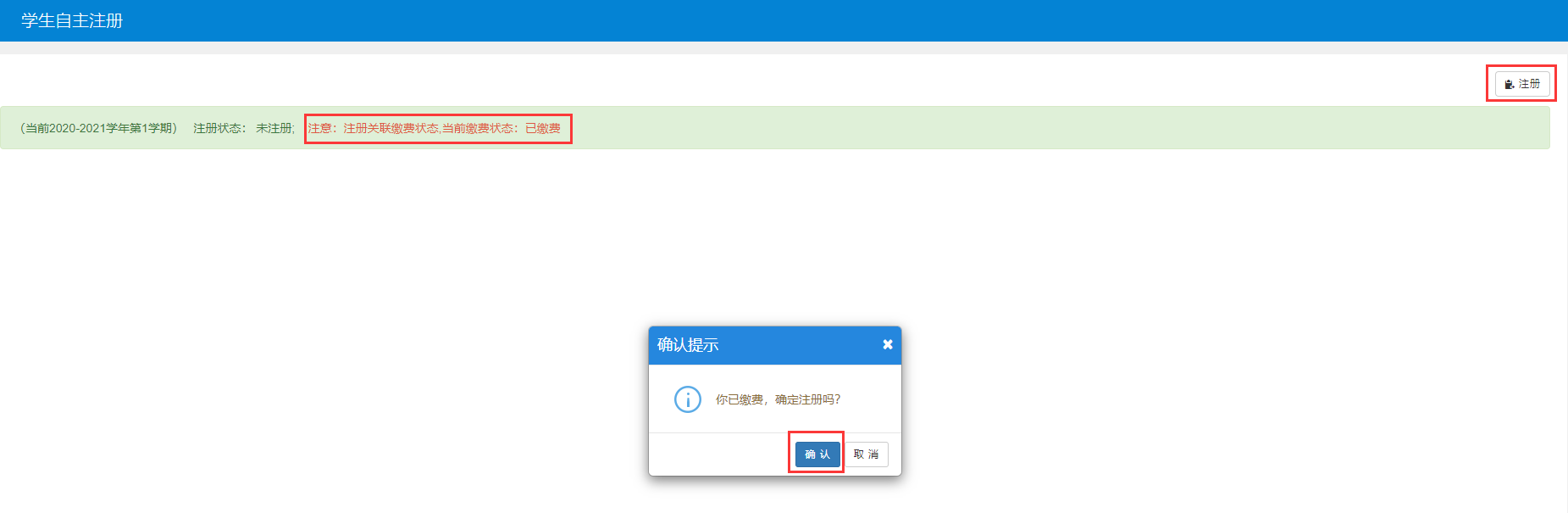 3、进入学生自主注册页面。注册关联缴费状态,当前缴费状态为已缴费者,点击右上角的“注册”按钮,弹出确认提示,点击“确认”即可完成注册。