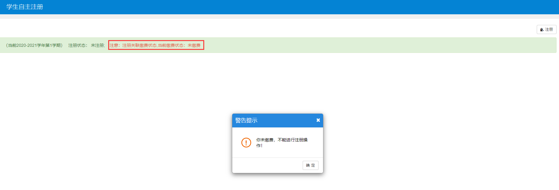 4、如当前缴费状态为:未缴费,点击注册按钮会弹出警告提示,需完成缴费后才能进行注册。