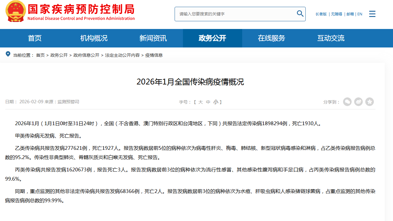 2026年1月(2026年1月1日0时至1月31日24时),全省共报告法定传染病310116例,死亡38人。