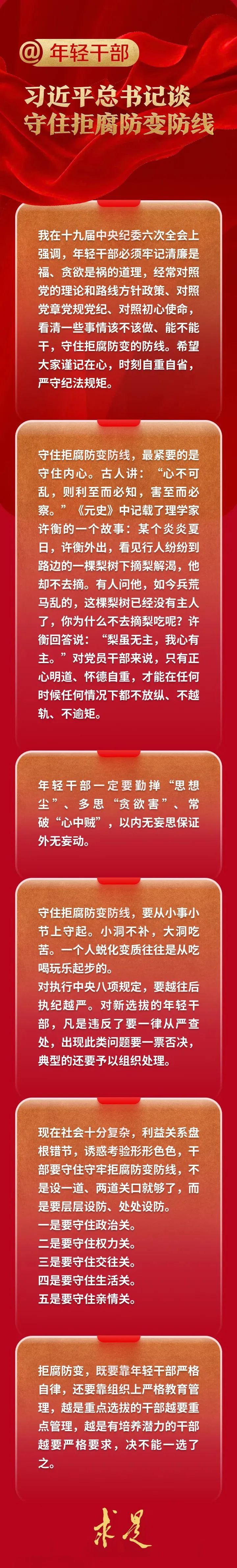 中,总书记强调:“年轻干部必须牢记清廉是福、贪欲是祸的道理”,“守住拒腐防变防线”。