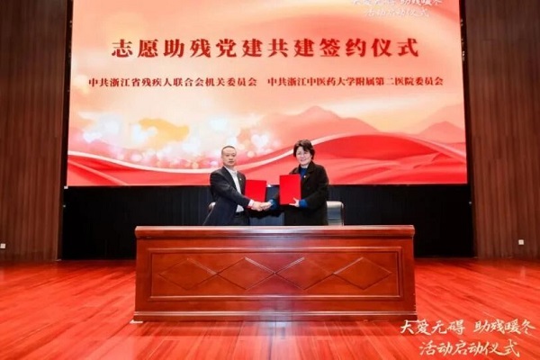 现场,省残联机关党委与浙江中医药大学附属第二医院党委等党组织签订党建共建协议,以组织联动打通助残服务“最后一公里”。