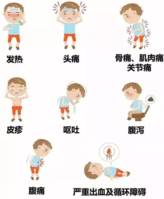 被携带登革热病毒的蚊子叮咬后,患者出现的症状很像流感。一般有以下几种症状: