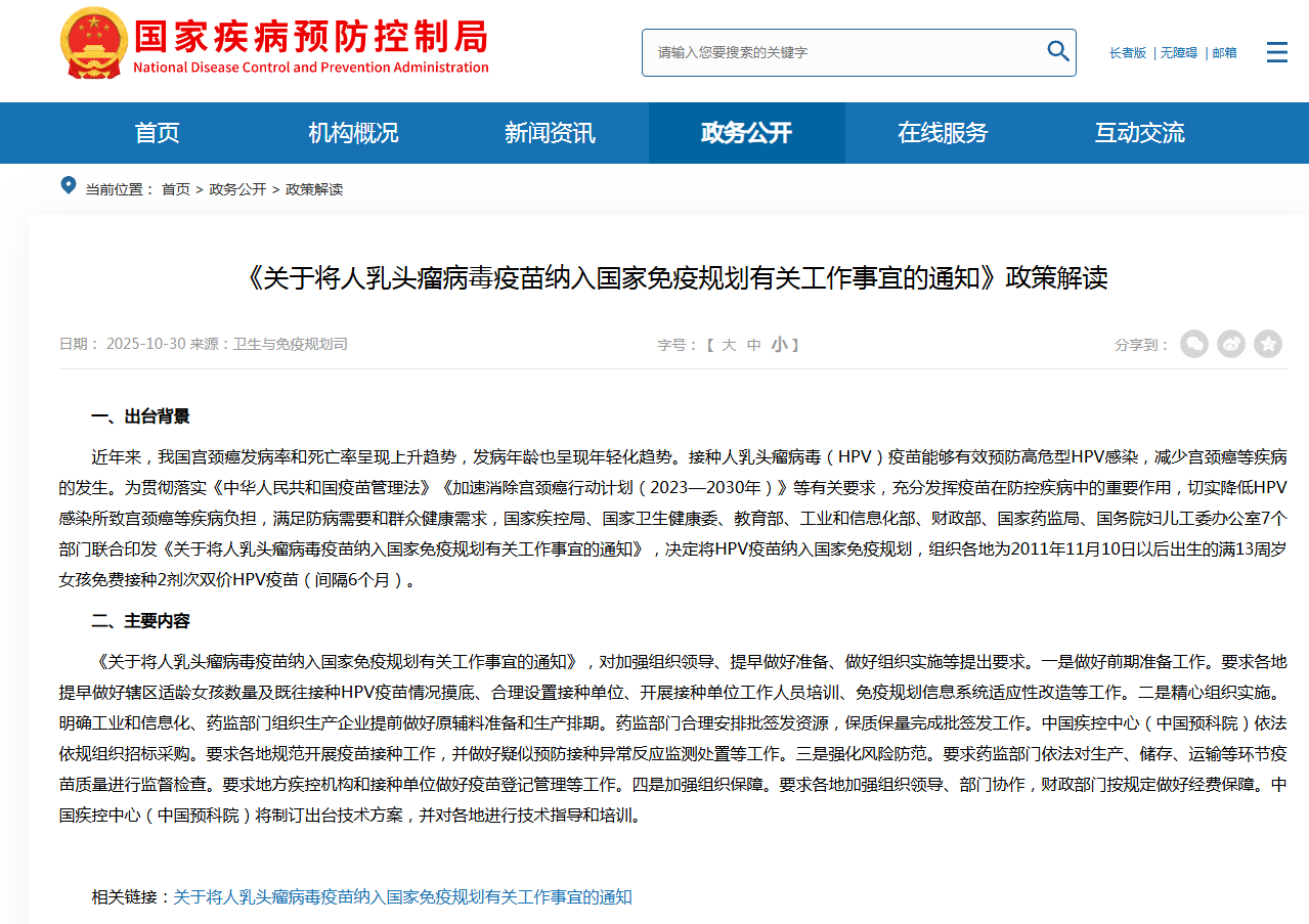 近年来,我国宫颈癌发病率和死亡率呈现上升趋势,发病年龄也呈现年轻化趋势。接种人乳头瘤病毒(HPV)疫苗能够有效预防高危型HPV感染,减少宫颈癌等疾病的发生。为贯彻落实《中华人民共和国疫苗管理法》《加速消除宫颈癌行动计划(2023—2030年)》等有关要求,充分发挥疫苗在防控疾病中的重要作用,切实降低HPV感染所致宫颈癌等疾病负担,满足防病需要和群众健康需求,国家疾控局、国家卫生健康委、教育部、工业和信息化部、财政部、国家药监局、国务院妇儿工委办公室7个部门联合印发《关于将人乳头瘤病毒疫苗纳入国家免疫规划有关工作事宜的通知》,决定将HPV疫苗纳入国家免疫规划,组织各地为2011年11月10日以后出生的满13周岁女孩免费接种2剂次双价HPV疫苗(间隔6个月)。